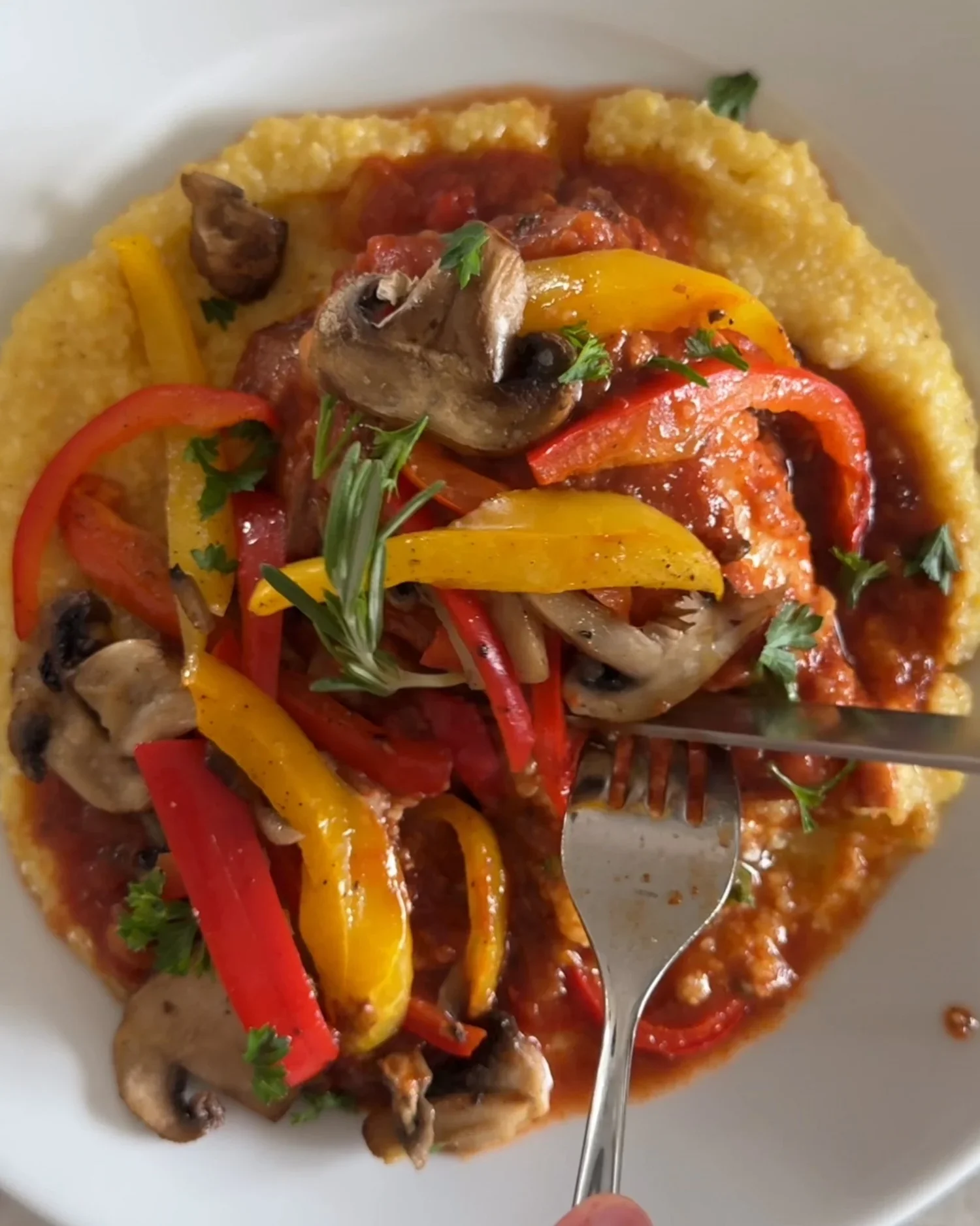 Impress someone special with this elevated chicken cacciatore recipe. Made with wine, mushrooms, and creamy polenta, it’s cozy, flavorful, and unforgettable.