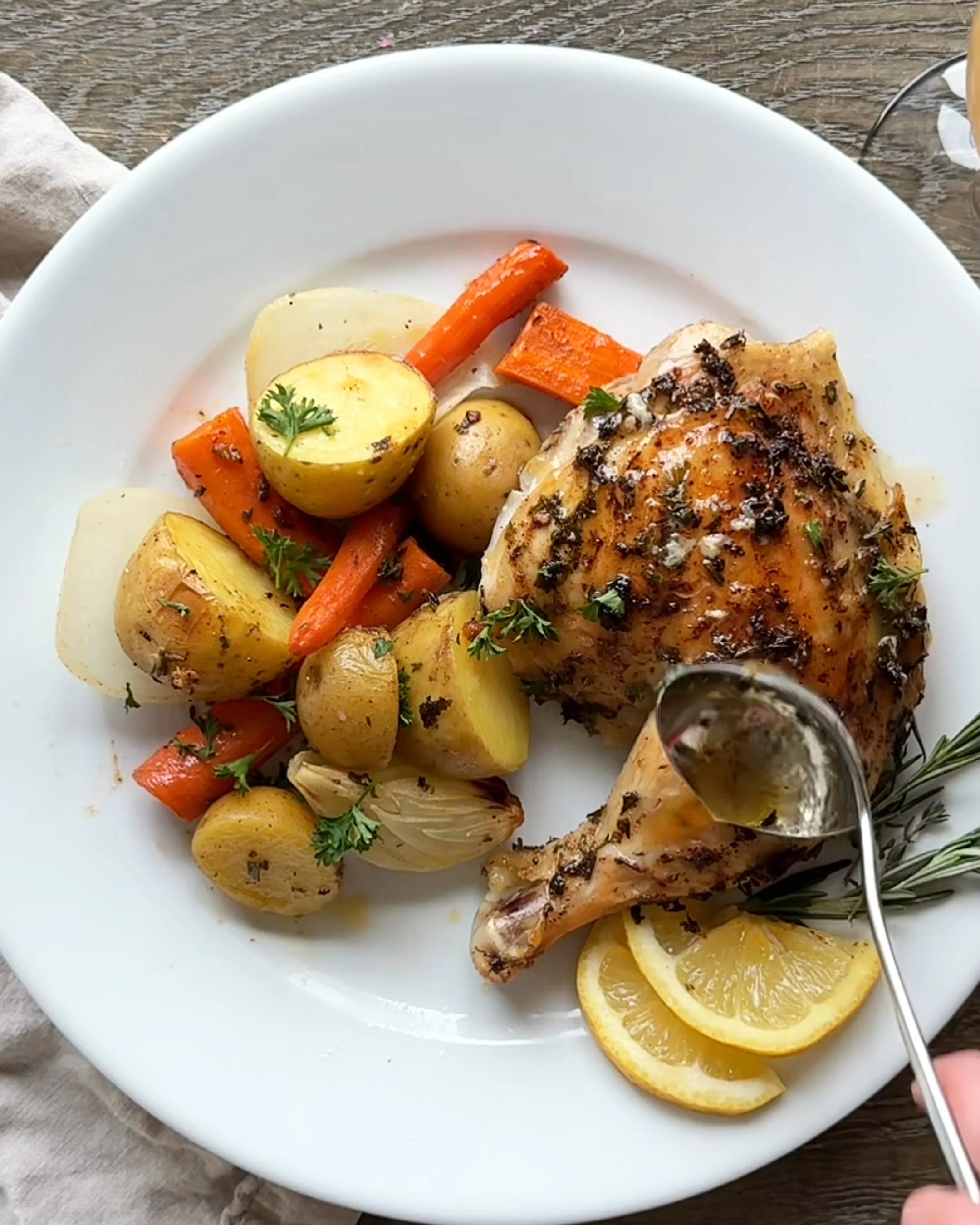 The chicken roasts up crisp and juicy with a smoky brown butter + bacon spice rub, while the root vegetables soak up all those savory drippings underneath. It’s a truly gourmet one-pan meal — but secretly so simple. Serve it with a crisp glass of your favorite drink for that looks-fancy-but-wasn’t candlelit dinner vibe.