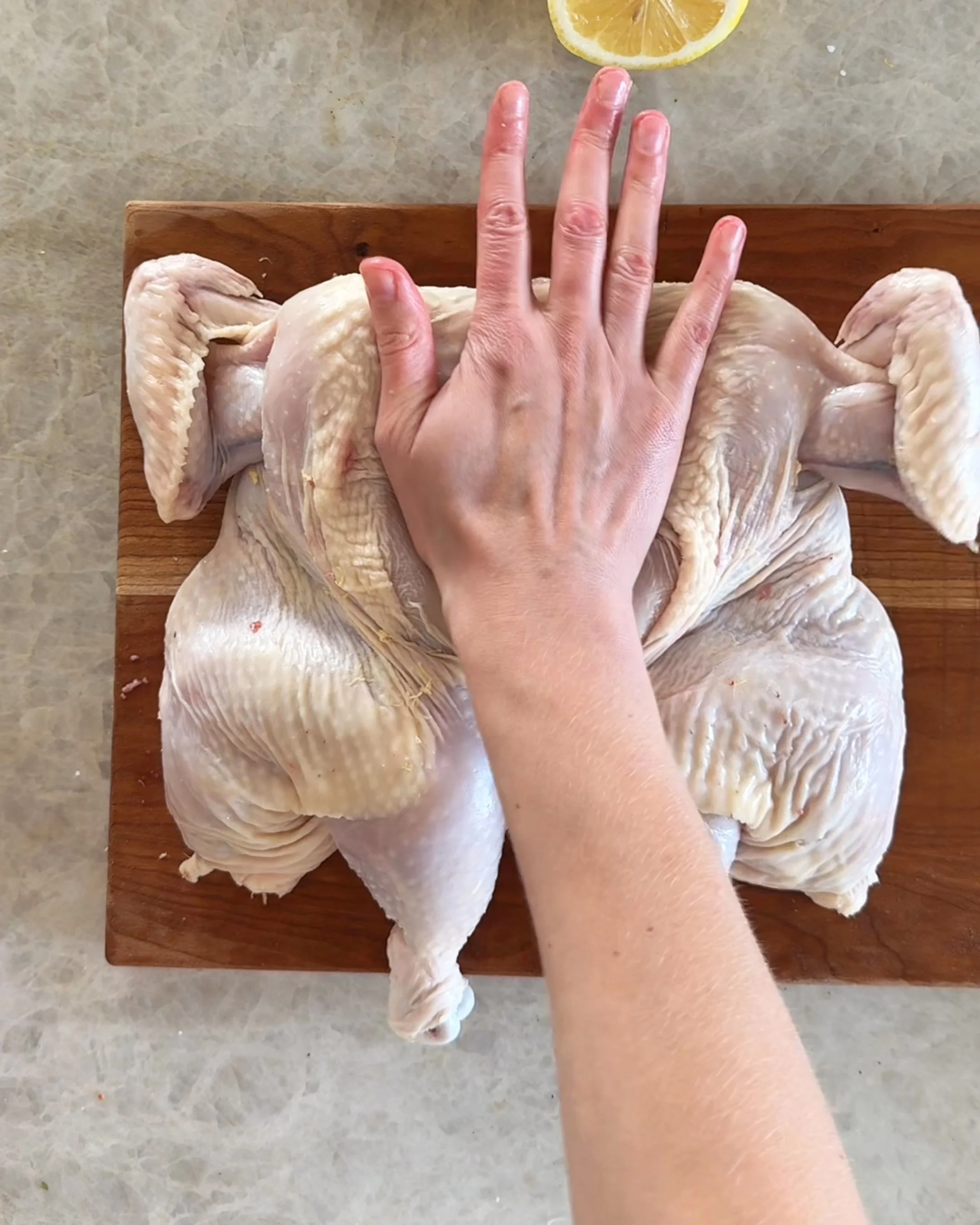 Finally, press firmly on the breasts with the heel of your hand to flatten the bird. You’ve now spatchcocked your chicken!
