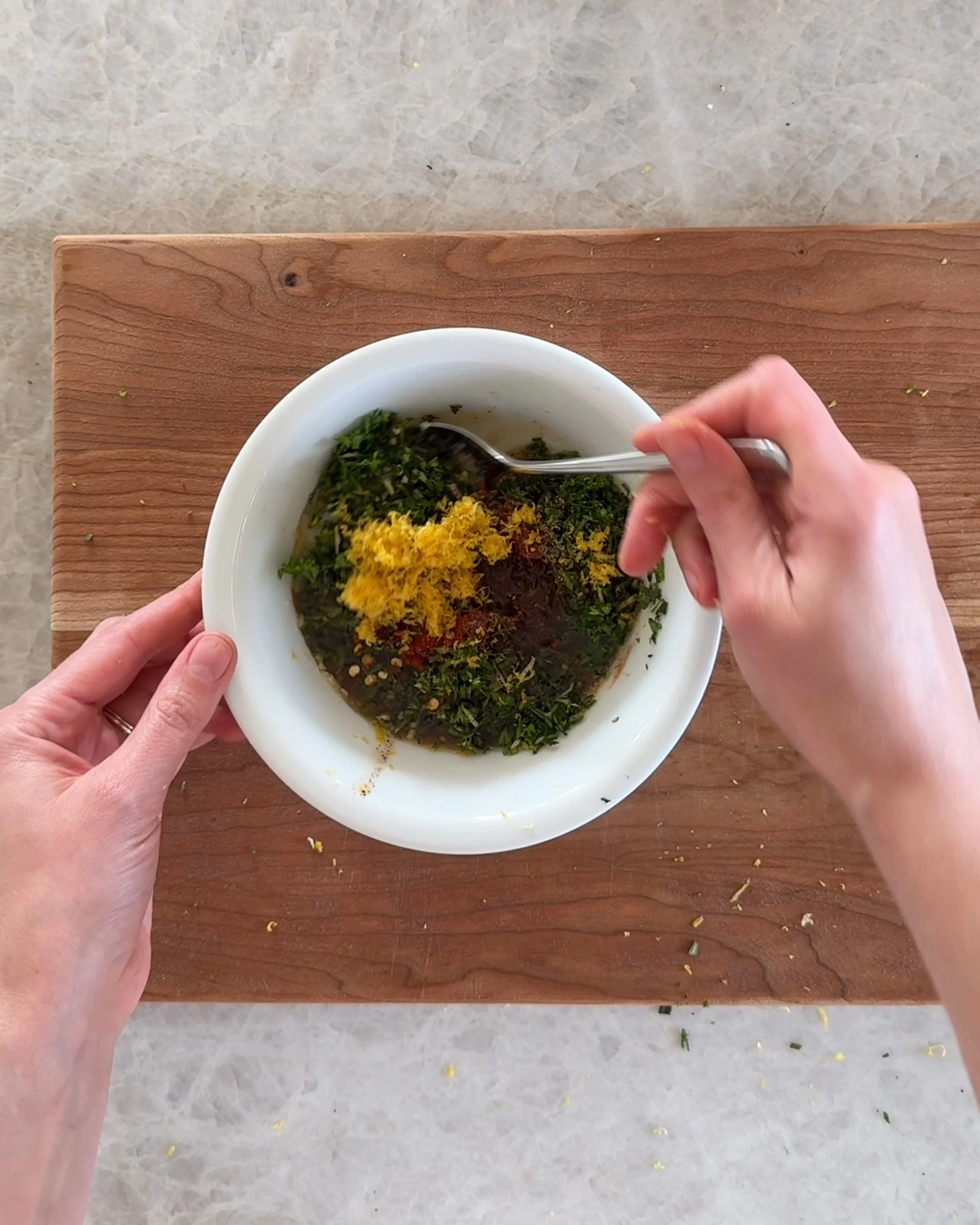 Mix brown butter, bacon fat, herbs, lemon zest, and spices into rich, flavorful paste.