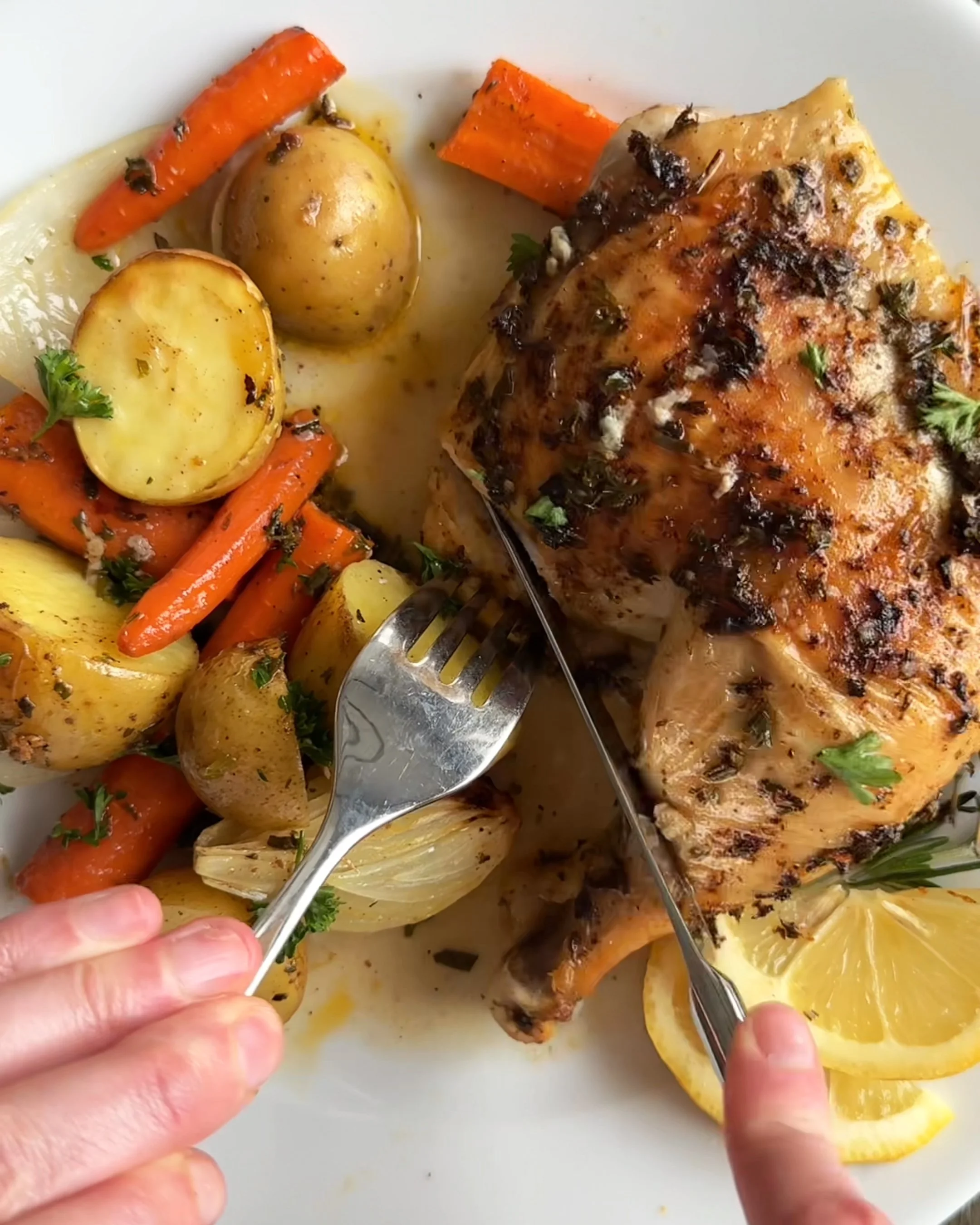 Garnish and serve. Top with extra fresh herbs and lemon slices. Carve, serve, and enjoy!