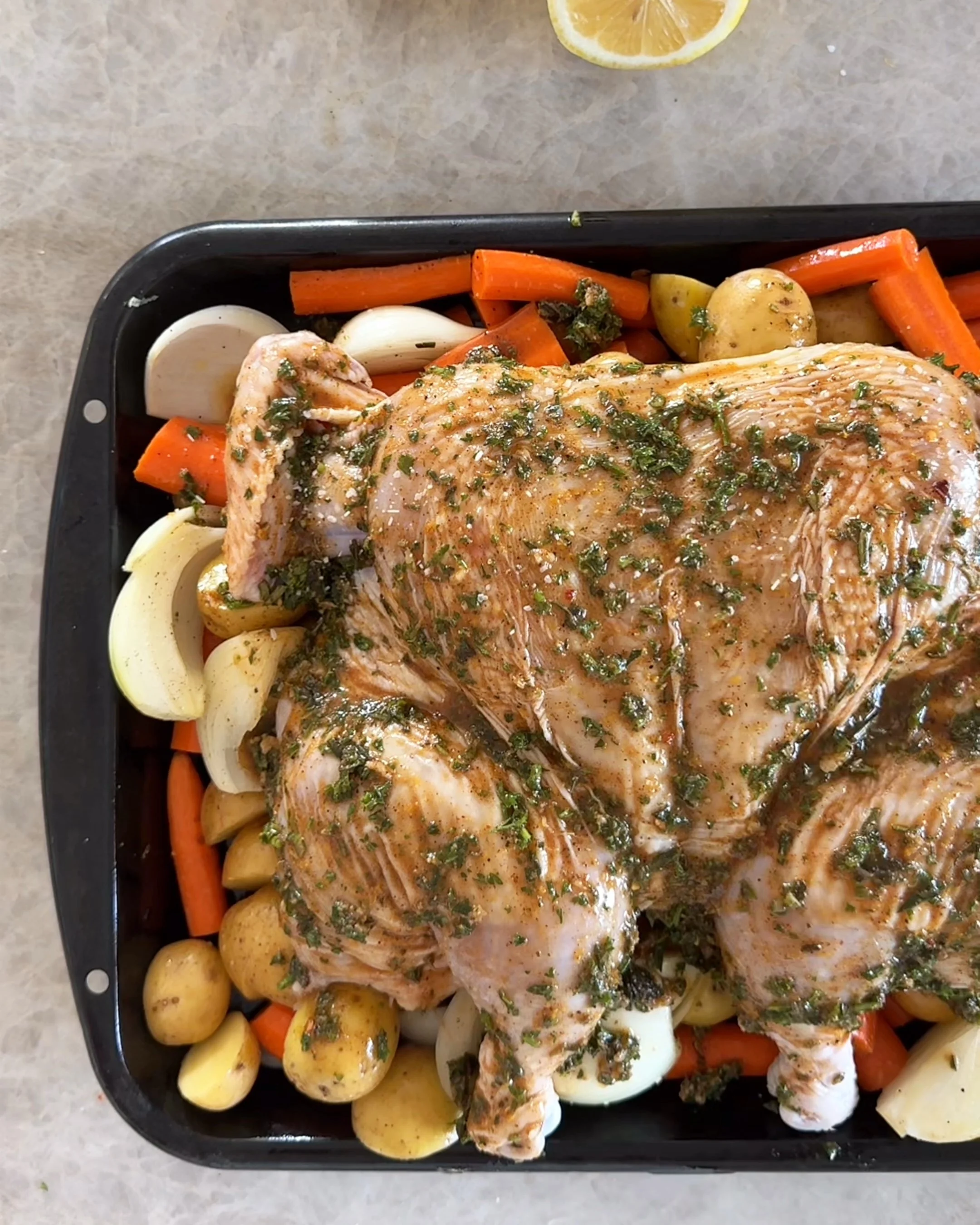 Assemble and roast. Place the chicken skin-side up on top of the vegetables. Tuck lemon wedges into the pan. Spoon the butter rub all over the chicken and massage it into the skin, coating the legs and wings. Sprinkle the top generously with kosher salt.